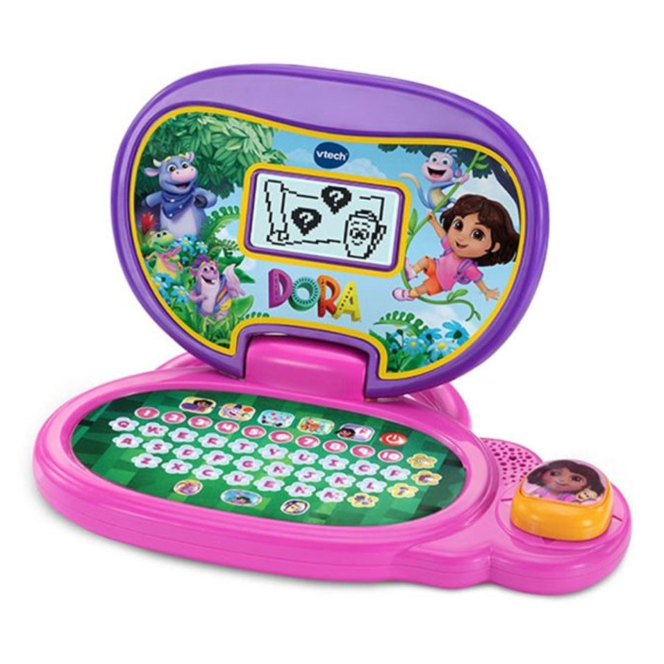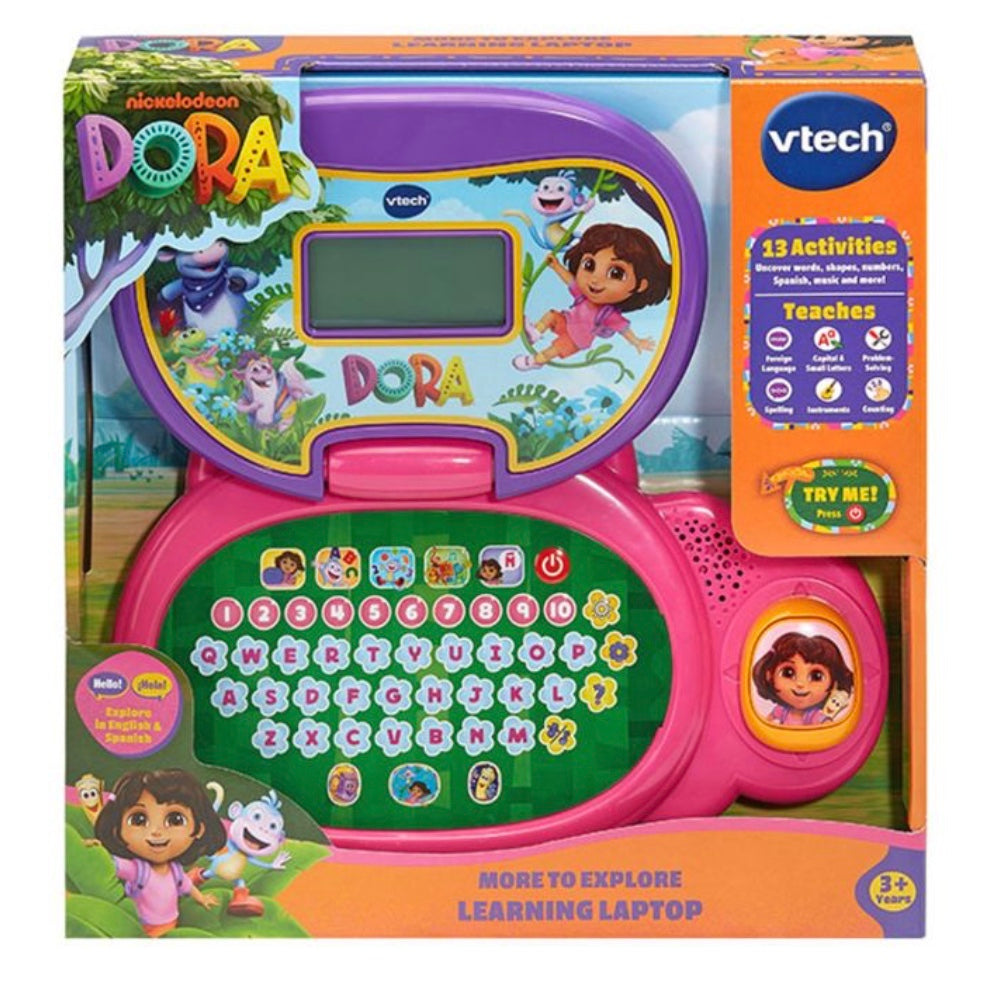 It's time to get exploring with the Dora More to Explore Learning Laptop by VTech®! This interactive laptop offers a variety of activities to introduce letters & words, numbers & counting, shapes, instruments, melodies and more! Get ready to learn some Spanish by exploring and learning with Dora! Enjoy 12 fun learning activities in total, with 5 character buttons! Features a full QWERTY keyboard with 26 letter buttons and 10 number buttons. See engaging animations on the backlit LCD screen which reinforce learning. Exciting light effects accompany the learning journey, to make each activity even more fun! Let's explore and learn!