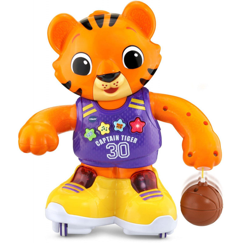 Teamwork makes the dream work! Get little ones moving with the Dribble & Bounce Tige from VTech! Warm up by crawling after Tiger as it runs the floor, keeping little ones engaged as they giggle and chase. Get in the game and cheer as Tiger shows some sweet basketball tricks, spinning or dribbling the ball. Now it’s time to play some defence! Try and catch Tiger as it scoots, swerves and dodges around obstacles using the built-in smart sensors. Engage in playtime even while taking a water break as applause erupts, or press the star buttons on the jersey to introduce numbers, songs and basketball phrases. It's a three-in-one play bonanza that boosts both language skills and physical play! 4 x AA batteries required.