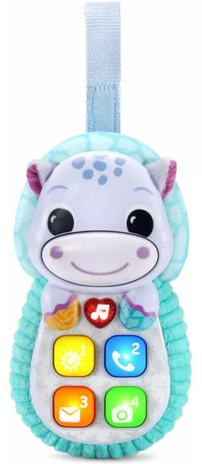 Press the light-up heart button for cute, upbeat songs, melodies, and lots of realistic phone sounds that encourage exploration. Varied soft textures encourage exploration. Press Hippo’s nose to trigger greetings and cute phrases! Includes an attachment strap so baby can be truly mobile