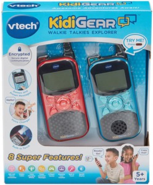 Chat; send messages and play games with the KidiGear Walkie Talkies Explorer! The cool new design and built-in torch helps you light the way while going on your very own adventures. Keep in touch indoors and out, at home or on the go! These child-safe two-way walkie talkies feature a digital connection that keeps your child`s conversations secure, preventing other walkie-talkie users from hearing. Have lots of fun trying the different built-in voice effects! Little adventurers can also send messages back and forth by choosing from the fun built-in animations. Walkie talkies also include four cool two-player games for real-time gaming between devices which test your memory skills and enhances play!