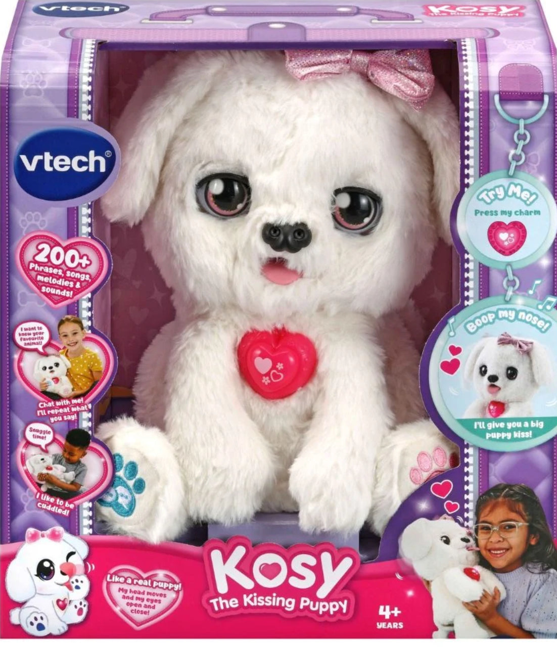 Say hello to Kosy! She loves nothing more than being with her best human friend and giving cute puppy kisses. Like a real puppy her eyes open and close and her head magically moves! Kosy is very inquisitive and wants to know everything about you. Press her paw button and tell her all your favourite things and she will repeat what you say. Press her other paw button to sing together.
