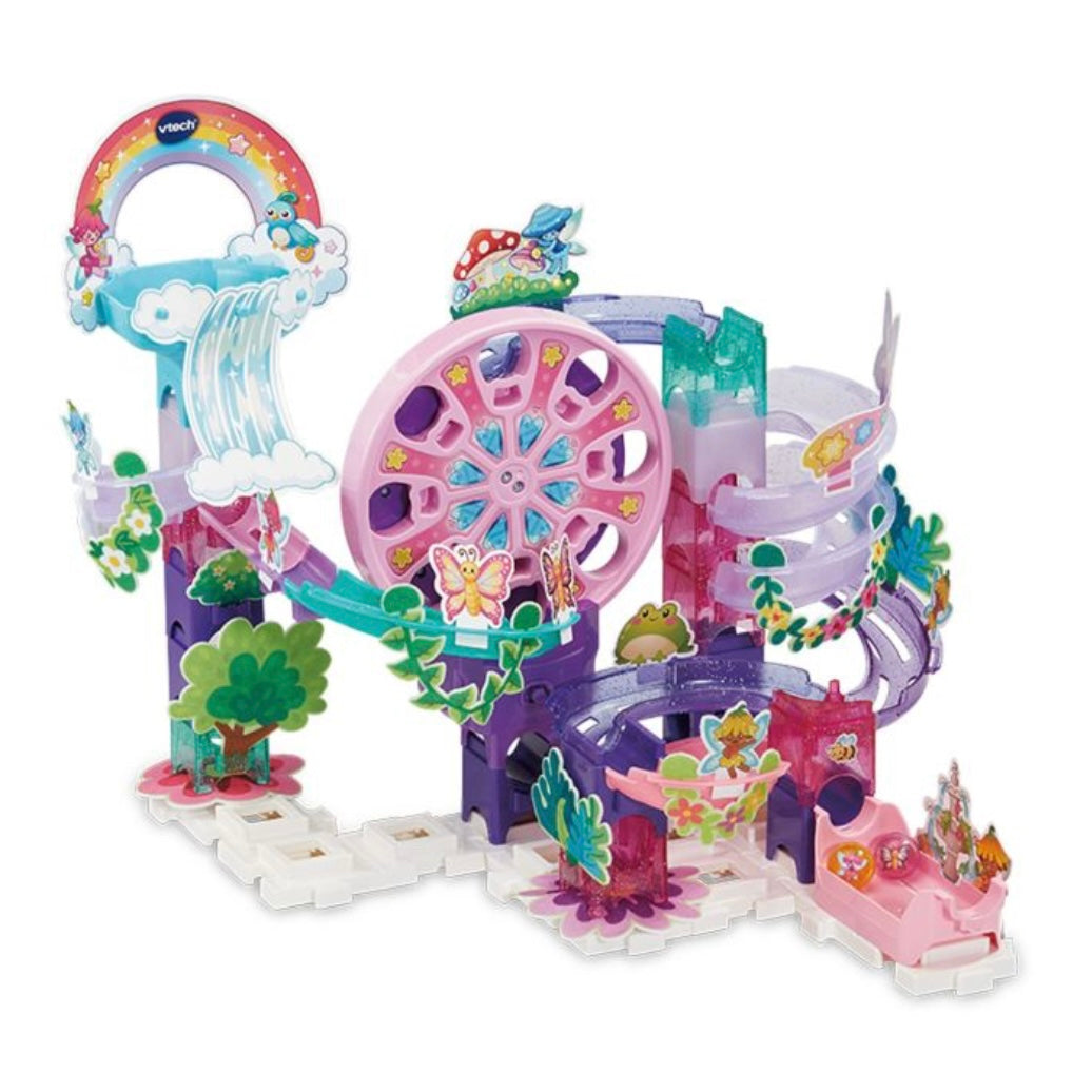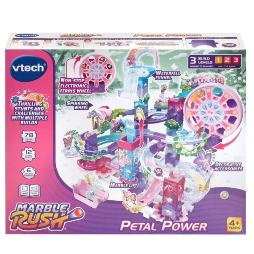 Time for some flower power with Marble Rush Petal Power by VTech®! This fantasy themed marble run features 96 pieces, including 12 decorative accessories, 6 sparkle marbles and 78 building pieces. Included in the set is a motorised spinning flower which raises and lowers marbles! Use the Lift to elevate marbles back up to the top for another run through this fantasy garden! Customise your Petal Power with the included decorative accessories, and see the sparkle marbles shine as they zoom down twists and turns! Compatible with other Marble Rush sets. Colour-coded levelled build guide makes assembly easy!