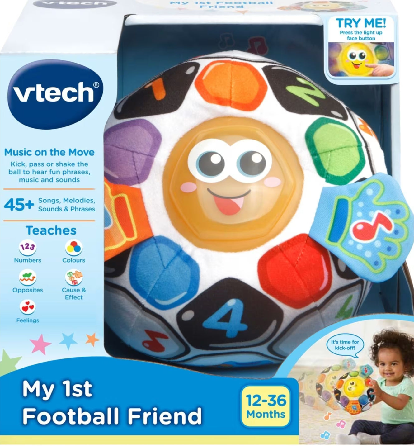 Meet your little football star's very 1st football friend, the My 1st Football Friend by VTech! With encouraging and fun phrases, this little football is great company for your little one as they grow. The soft light-up face button plays three sing-along songs, 15 melodies and rewarding responses when pressed. With a built-in motion sensor that triggers even more great responses when your little dribbler dribbles the ball. All while developing your little one's motor skills through imitative play and supporting their early language skills. This toy features a removable electronic module, so the football can be hand-washed.