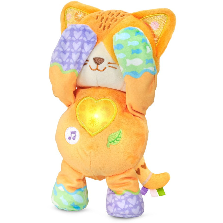 Peek-a-boo, I see you! Watch and learn as Kitty uses its patterned paws to cover and uncover its eyes to show little ones it’s always there, even when they can’t see its face. With the simple repetition of each ‘peek,’ little ones will be fascinated as they realise Kitty hasn't disappeared. They’ll be able to control Kitty’s easy movements by pressing the big heart button, introducing cause and effect. Two milestones, one kitty! Nestled next to the heart are two musical buttons: press the music note and leaf designs to hear songs, melodies and explore different sounds of nature. Three colourful ribbons and a soft plush body make this friendly feline the purrfect playmate. Peek-a-Boo Paws is ready to look around and meet its new friend!