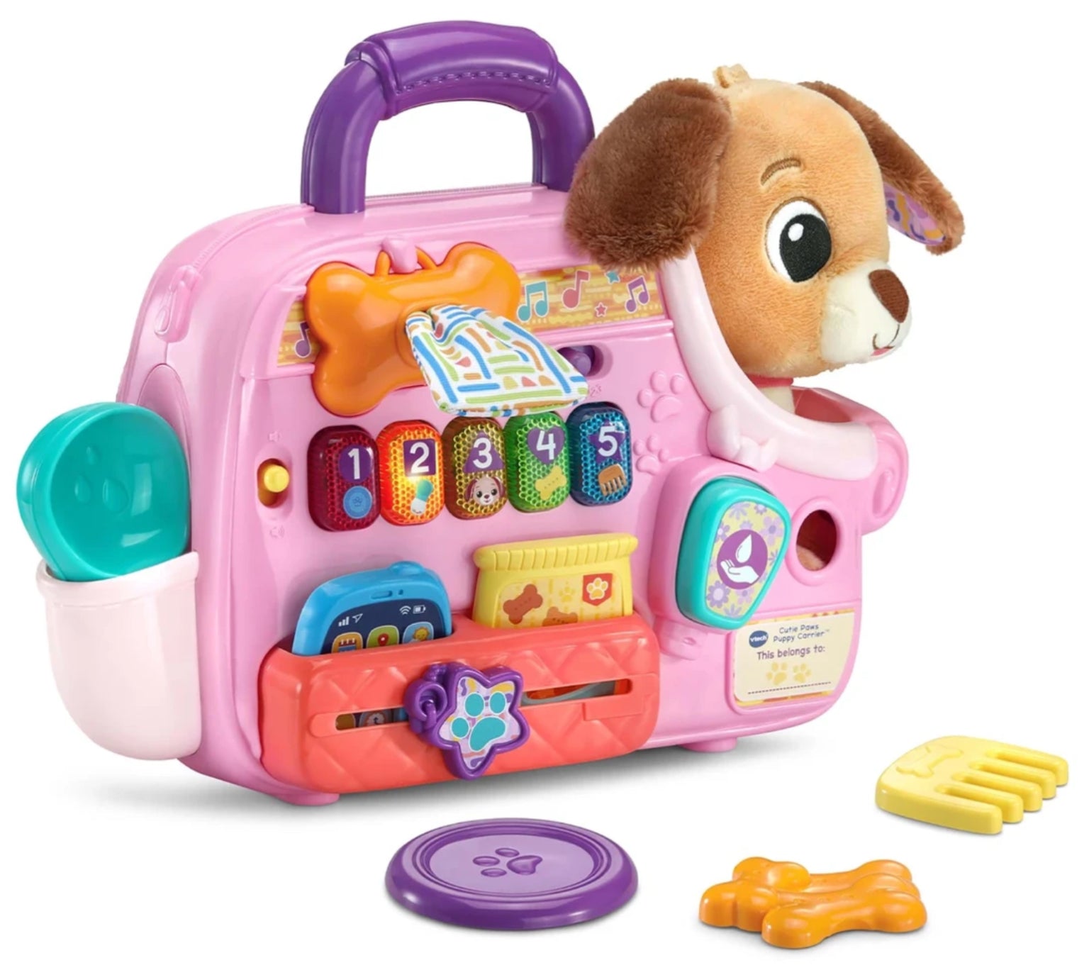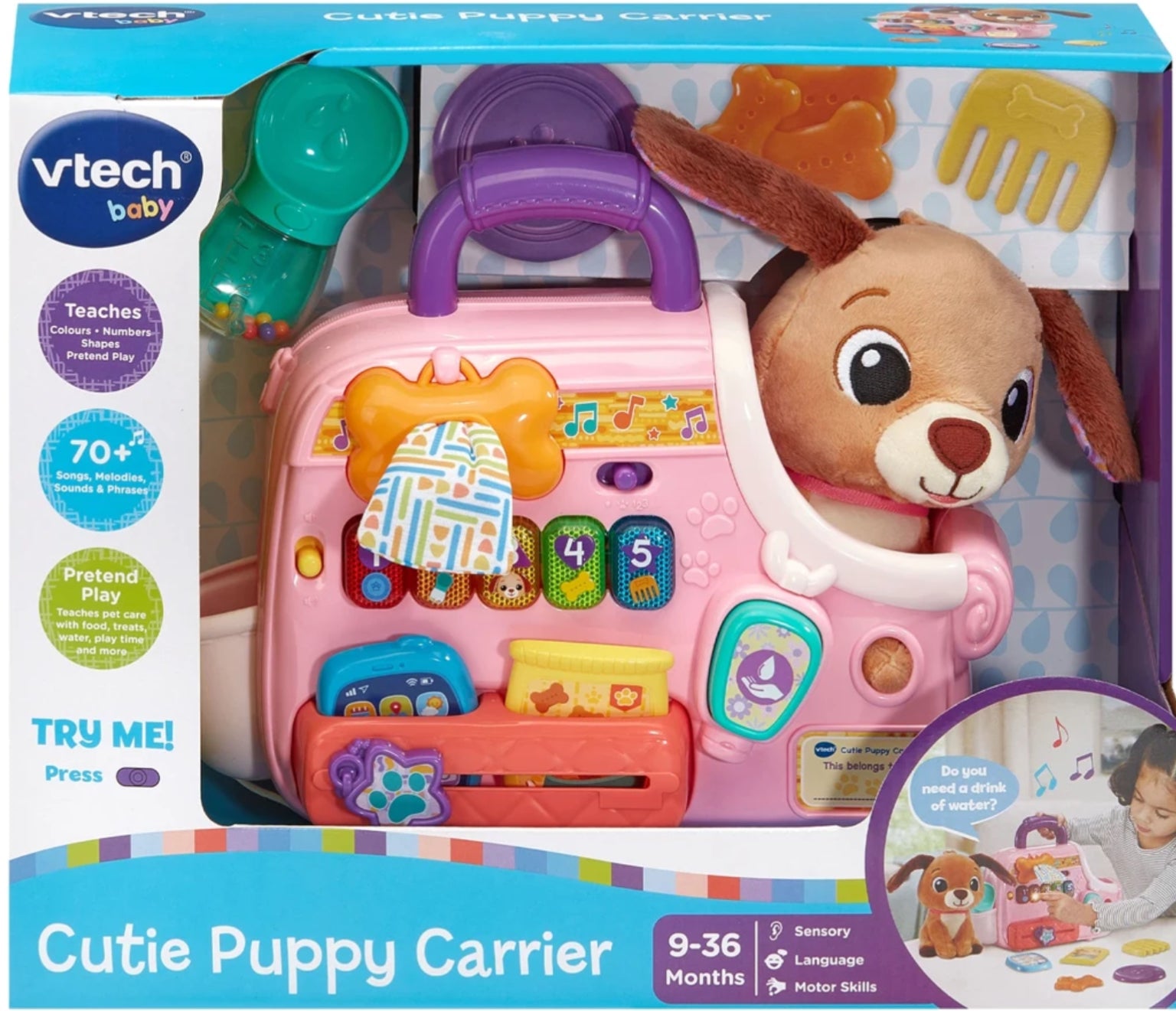 Press the colourful buttons on the sturdy carrier to introduce numbers, colours, shapes and sweet pet care phrases that disguise learning through playtime. The snuggly puppy is ready for love and care, ideal for teaching little ones about gentle play. The carrier also features a special holder to keep all the toys organised, making it easy to take this new pup friend on adventures. What a barking good time!