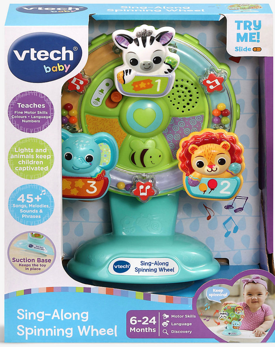 - Spinning wheel design, 3 animal-shaped buttons, triggers sing-along songs and sounds, wheel-spinning triggers more sounds, flashing star-shaped lights, suction cup at the bottom