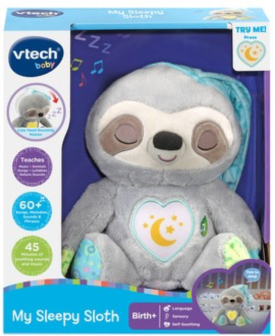 This adorable and soft fabric sloth is ideal for soothing little ones. My Sleepy Sloth plays soothing sing-along songs, peaceful melodies, relaxing lullabies, calming phrases and gentle sounds which ease little one. Various soft fabrics on My Sleepy Sloth allow for tactile stimulation and sensory discovery. Sloth's light up heart button triggers responses and acts as a nightlight with up to 45 minutes of sounds and melodies. Leaf button can pause and play music responses. There are 3 sing-along songs, 5 stories and 25 melodies in total.