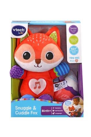 VTech Snuggle & Cuddle Fox has lots of character and wants to be baby`s new best friend! Fox`s soft fabrics and crinkle ears and legs provide comforting tactile and auditory stimulation. Pressing Fox`s light up tummy triggers soothing melodies, calming sing-along songs, relaxing nature sounds and loving phrases designed to soothe your little one, whilst promoting sensory and auditory development.