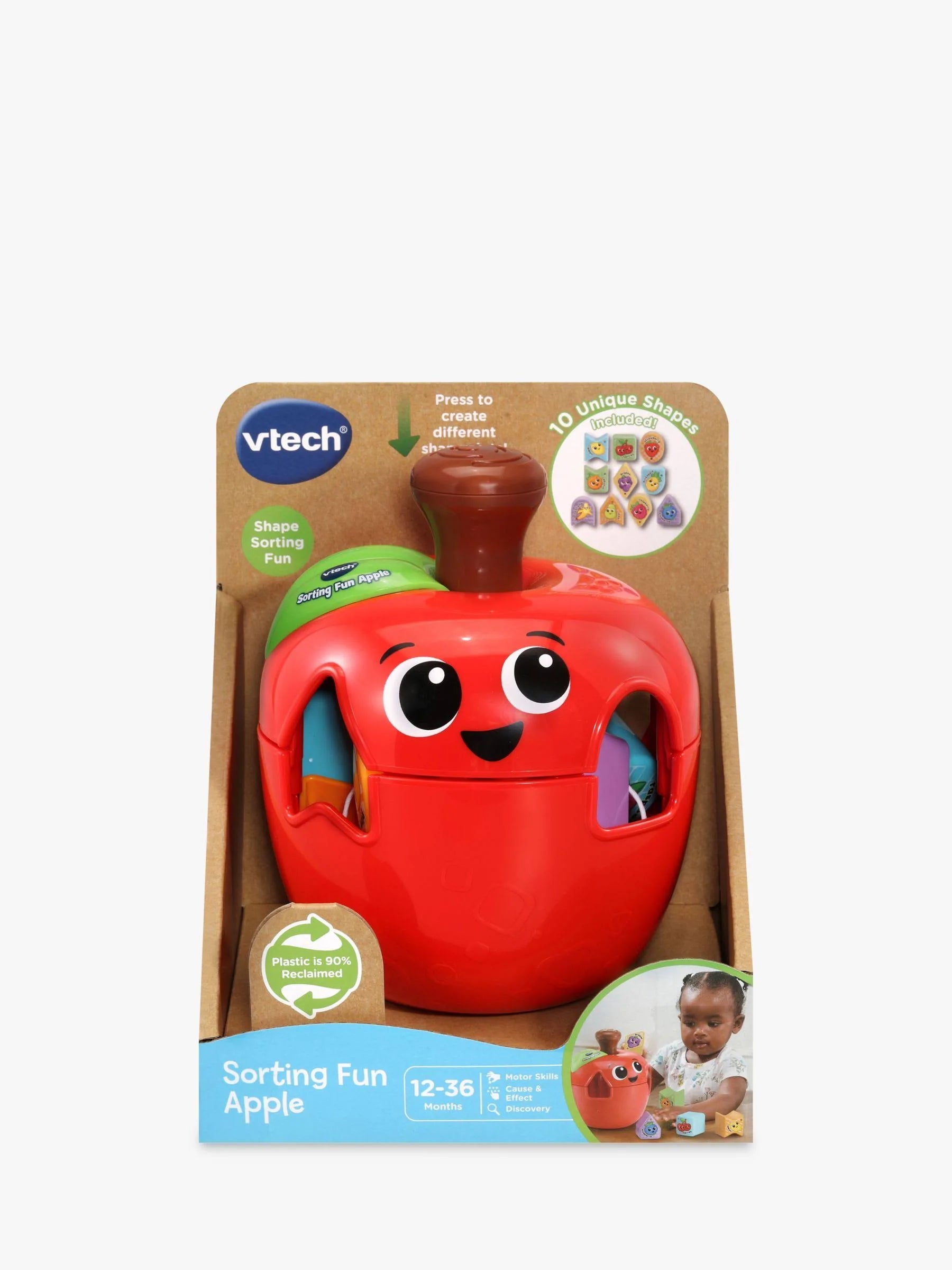 Let’s spin and sort with the Sorting Fun Apple by VTech. A new spin on shape sorting! 90% reclaimed plastic Made from 90% reclaimed plastic, this cute, chunky shape sorter apple spins at the press of its stork, spinning around to create both classic shapes and more unique shapes – go beyond square, diamond, oval and bow! 2 levels of learning Comes complete with 10 different shapes with 2 levels of learning: Level 1- 4 classic shapes or level 2- 6 special shapes.