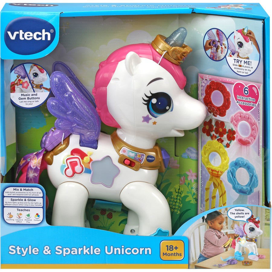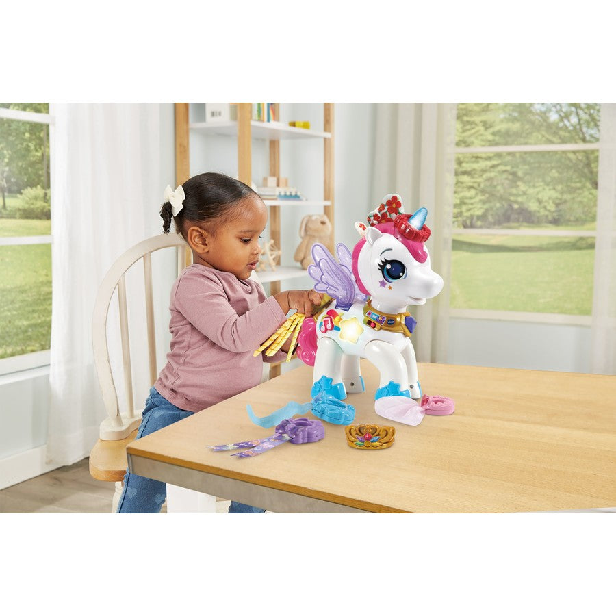 It’s a magical day when you play with the Style & Sparkle Unicorn. Let’s accessorise! Choose from six glamorous accessories to decorate the unicorn’s horn and tail. The ribbon is purple! Hear the unicorn describe each accessory and explore colours, counting, feelings and more. Coordinate the colour of the unicorn’s star by pressing the gem on her necklace. As she plays dazzling sounds, place an accessory on her horn to see her star change colour to match. Add music to the colourful dress-up party by pressing the music button. The unicorn will play five- or ten-minute songs and her horn and star will flash to the beat. Flap her wings to help her fly and together you’ll sparkle wherever you go!