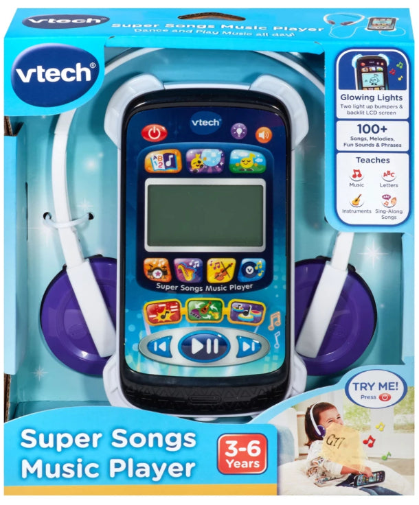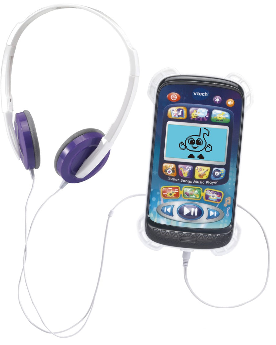 Explore and learn with the cute animated character on the Super Songs Music Player by VTech ! Enjoy fun interactive games, music and relaxing activities with included kid-safe headphones! Jam to 10 sing-along songs and 45 melodies! Little listeners can explore different styles with 4 albums including Rock, Jazz, Classical & Pop, encouraging them to discover the world of music! Dance along to the instructions in Dance Party mode, or relax and unwind in the calming Chill Zone mode.