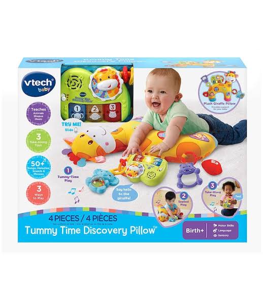 VTech - Get comfy while having fun with the Tummy Time Discovery Pillow by VTech. This soft pillow features a friendly giraffe and provides comfortable support for your baby with three ways to play. The crescent-shaped pillow provides support during tummy time play as your child begins strengthening their neck muscles. It also supports them while they are learning to sit on their own. As your child grows, it is great for take-along play. The pillow has multiple textures, patterns and colours for visual and tactile stimulation. Light-up piano keys on the removable piano introduce numbers, colours, shapes and animals, and play sing-along nursery rhymes, music and short tunes. Plus, the removable baby-safe mirror and rattle are perfect for on the go play.