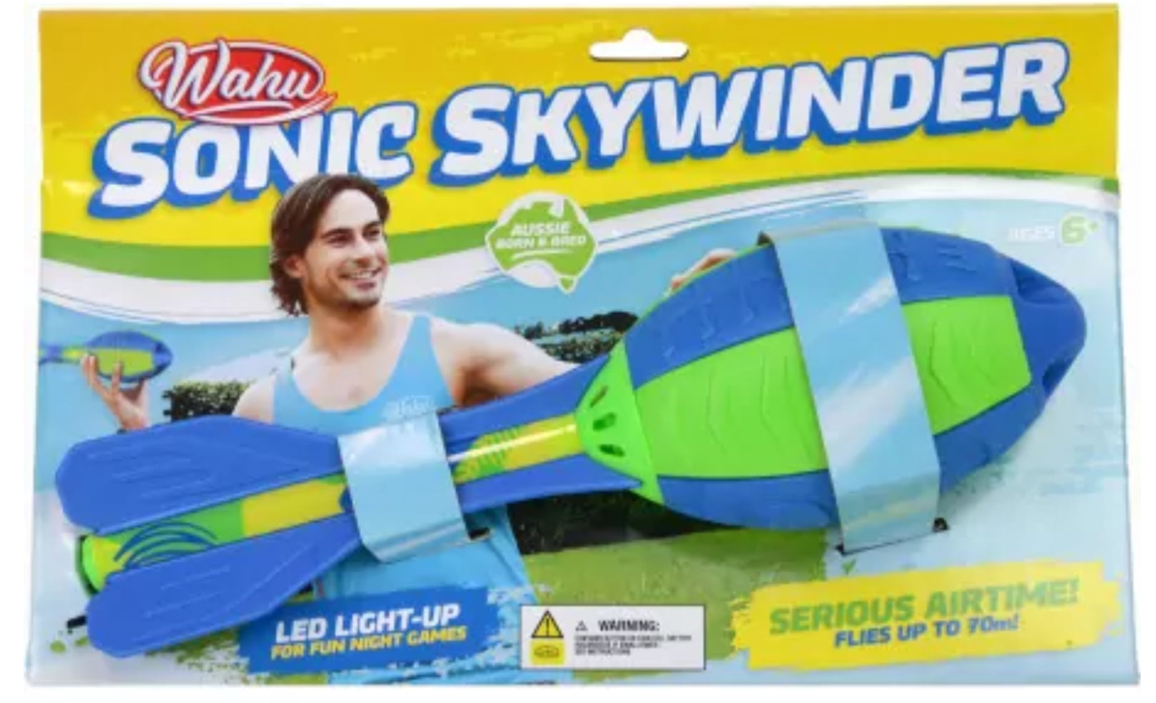 For the ultimate throwing rocket, you can't go past the all-new sonic skywinder! With its sleek aerodynamics design combined with its totally unique rocket sound, you can launch faster, longer, more accurate spirals that sound amazing! So you can continue playing after dark, the sonic skywinder is fitted with an LED light! Soft and safe for easy catches!