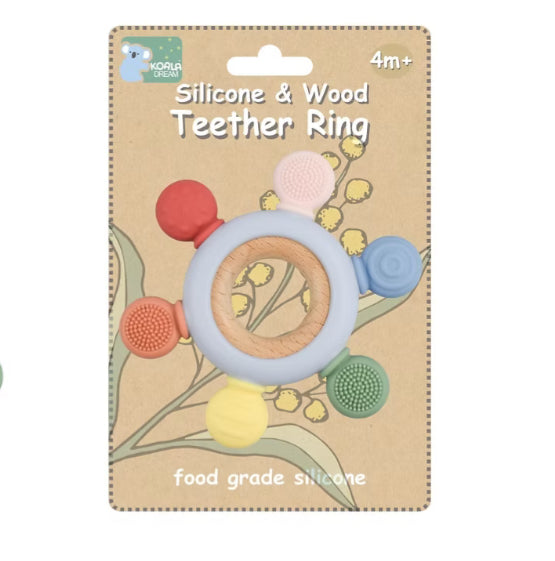 Discover the perfect soothing companion for your little one with this teething ring, which features a beautifully finished natural timber ring decorated with BPA-free, food-grade silicone beads.